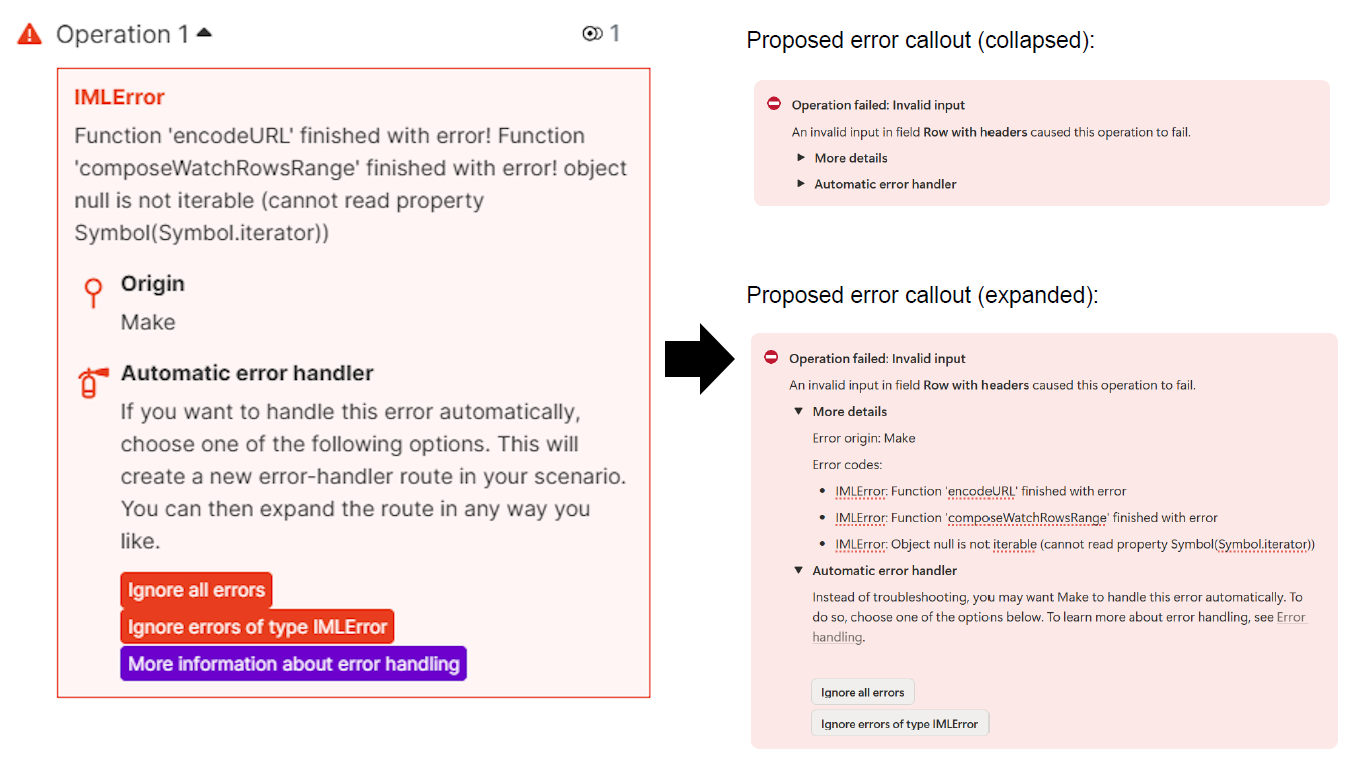 Thoughts: This error message is accessed in a modal by selecting the module where the error has occurred. The callout header of the error (“IMLError”) doesn’t tell the user anything. The language is overly technical and doesn’t reference anything from the UI, or anything that the user is likely to know already.