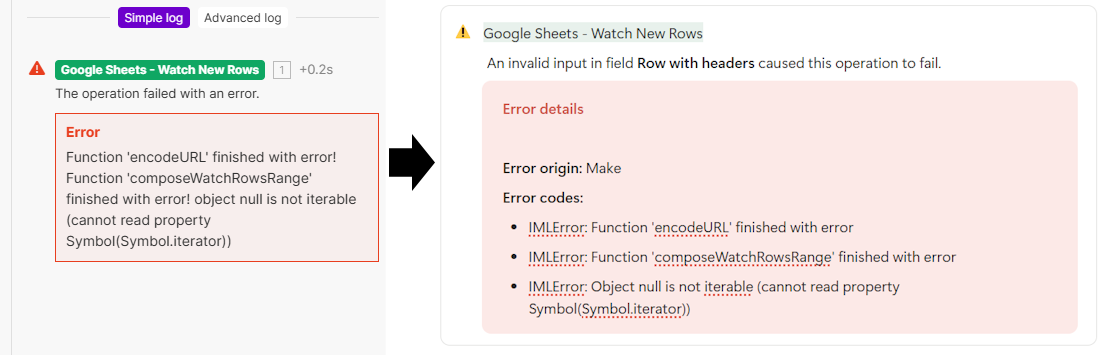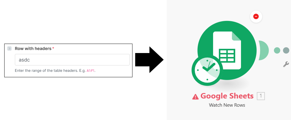 To create our error state, I inputted a nonsense value into one of the setup fields in the Google Sheets module, then activated the scenario.