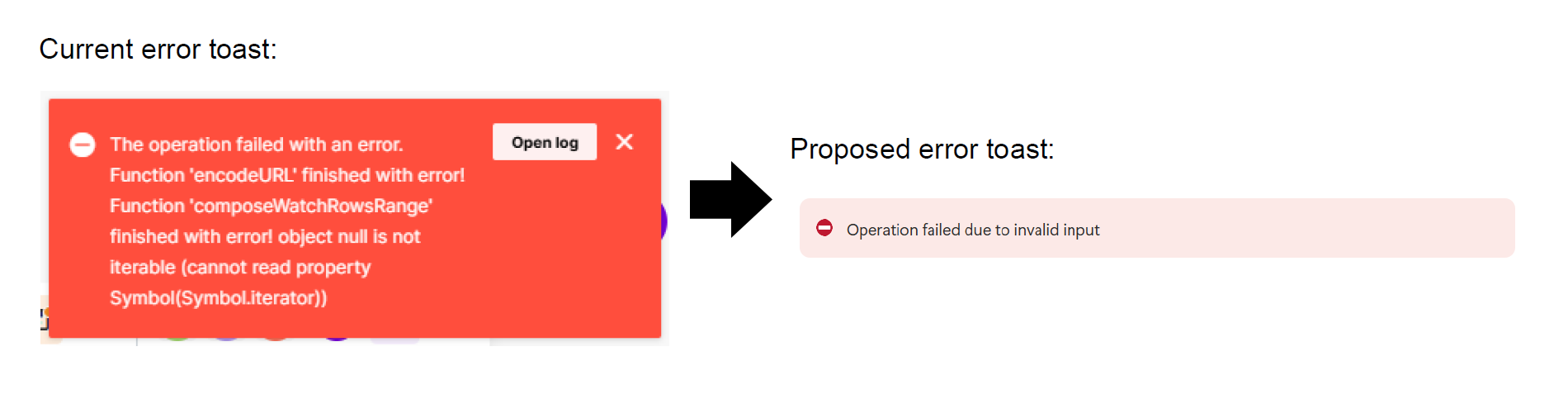 Thoughts: This error messages is presented as a standard toast, meaning it disappears after 3.5 seconds. This is not enough time to read the existing error or to understand that I may want to click the Open Log button. Toasts are only meant to give the user brief feedback on their actions. It’s not advised to have either a button and an X-to-dismiss for this reason.