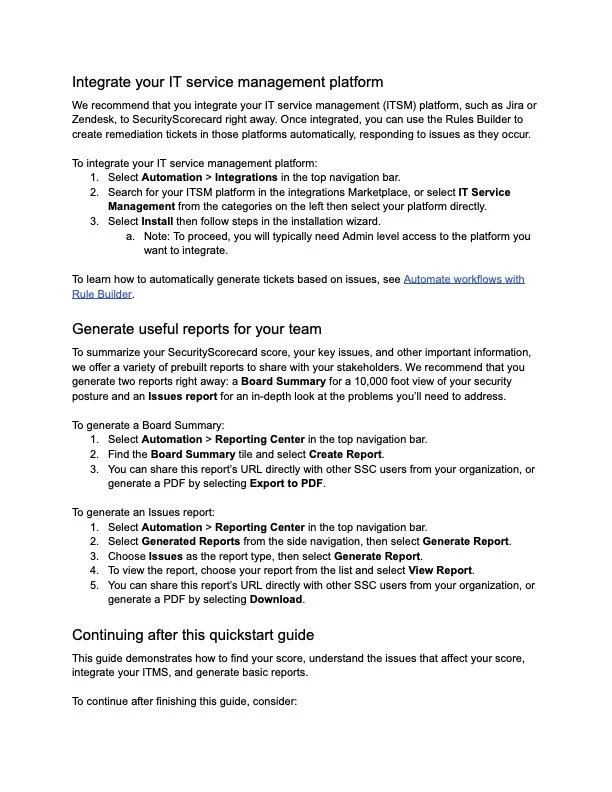 The Help Center has too many articles to be browsable, so search functionality is most important. Titles and keywording need work. There are some stars but most docs are in rough shape. Definitions are difficult to find: basic information does not get its own HC article and is usually embedded inside a larger article with an unclear title. Searching for key terms often fails because articles have similar titles ("score factor" returns "Scorecard overview", "Prepare for a scoring recalibration", "How SecurityScorecard calculates your scores", etc. The answer to "What is a score factor?" is inside option #3.). This may be an article keywording issue. Documentation is out of date. More than one dead link inside documentation. Articles that have been superseded but are still active.