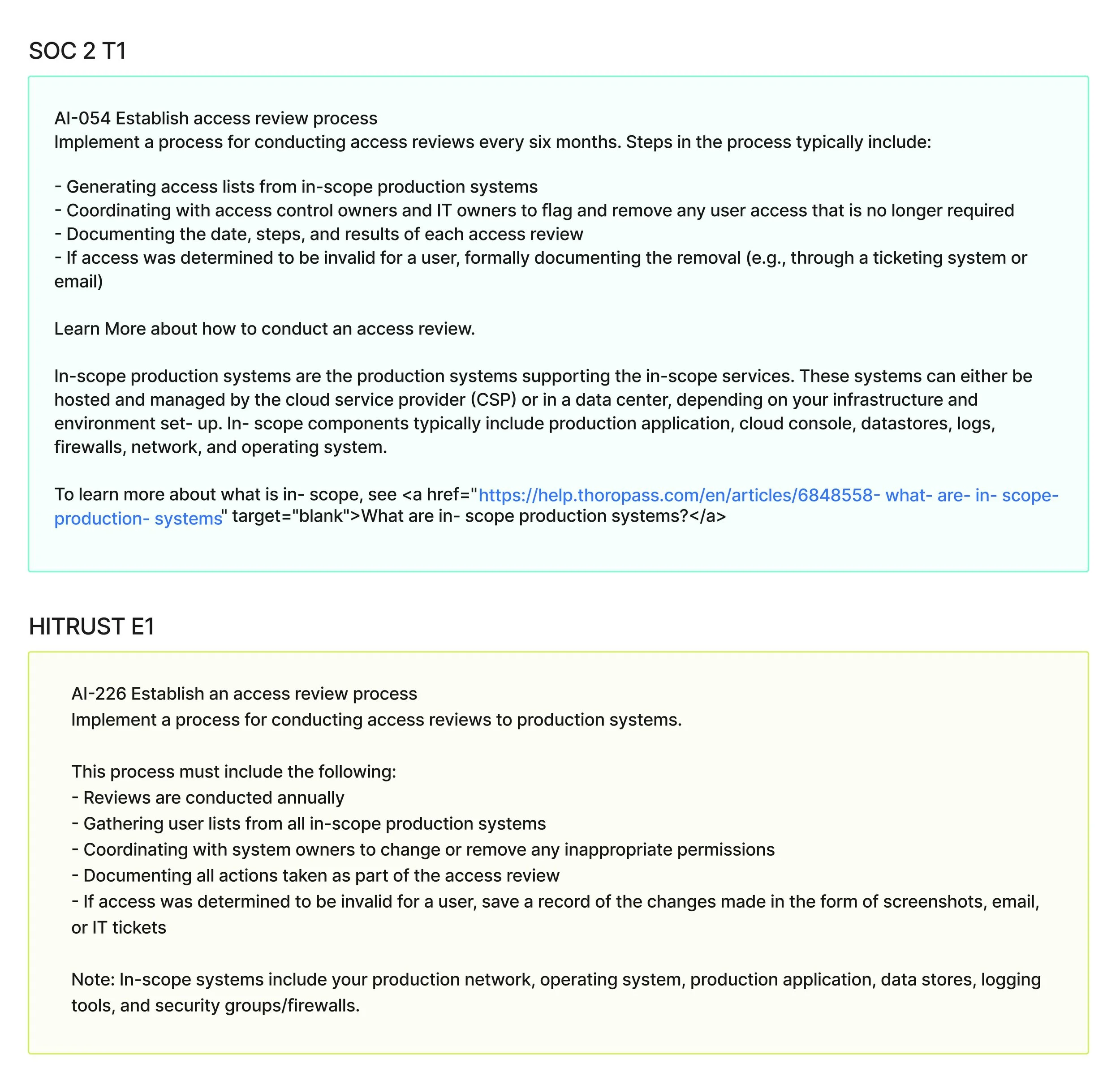 The issue of duplicate content was everywhere in the app. For just one example, when clients with both SOC 2 and HITRUST content needed to conduct access reviews (Access reviews are the process of validating that users have the correct access to resources in your company), they would see these two pieces of instruction: